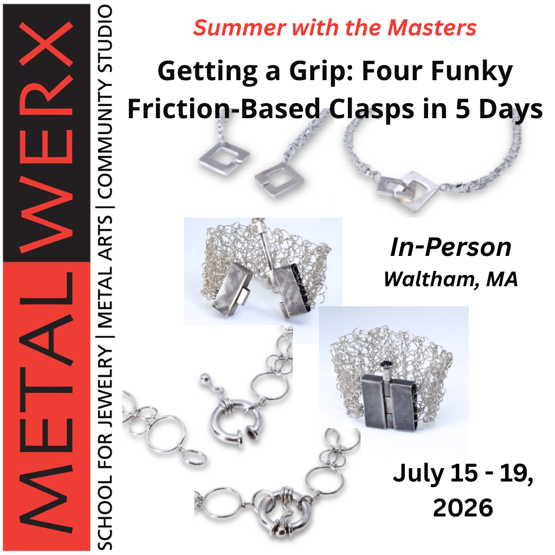 Tension. Friction. Gravity. Entrapment. Delve into four clasps which each use FRICTION as a critical aspect of their functionality, but which are so distinctly different in behavior that you’ll develop and improve a wide array of skills. Learn the Slotted Washer Clasp, Foldover, Knocker, and Hinged Bracelet Clasps.